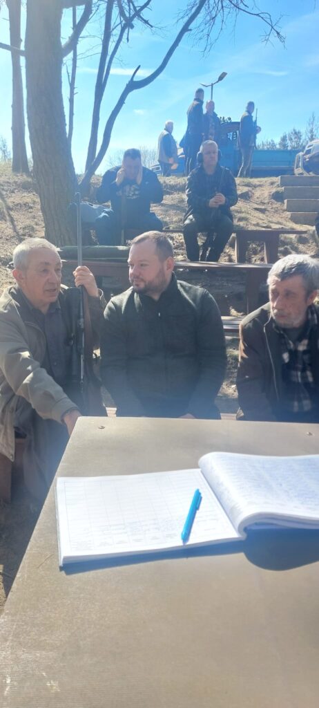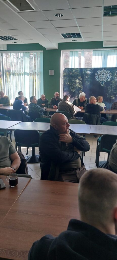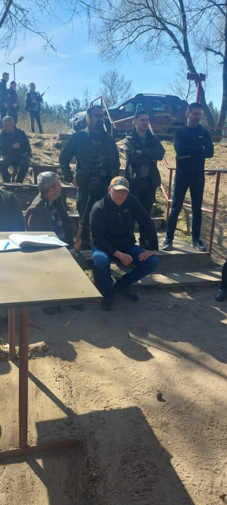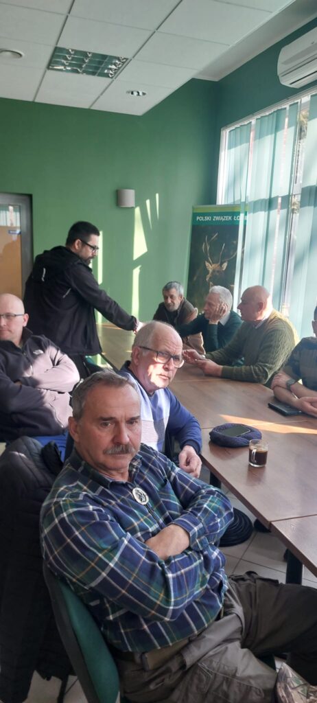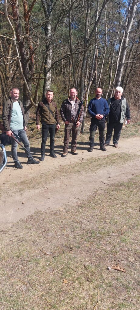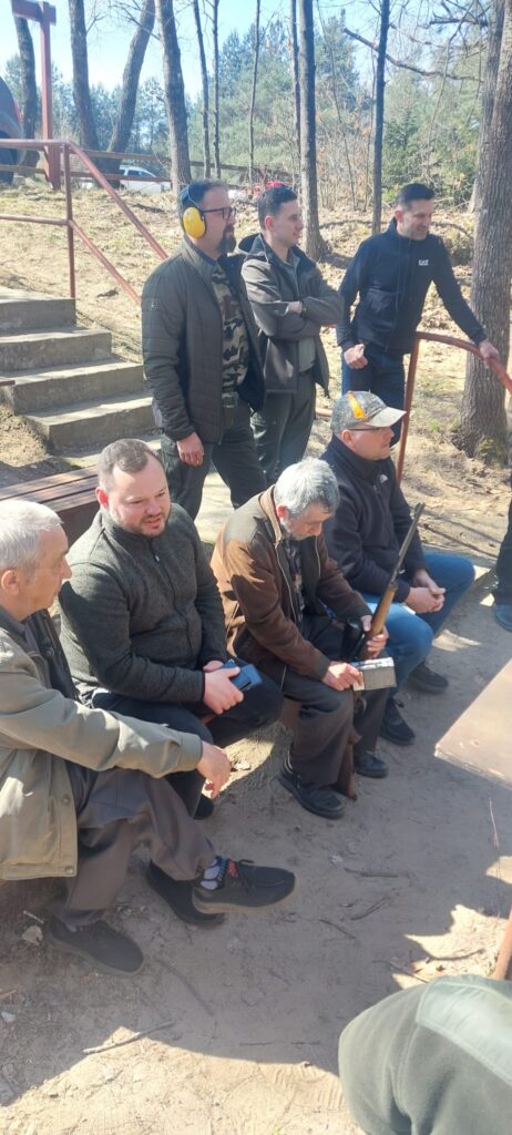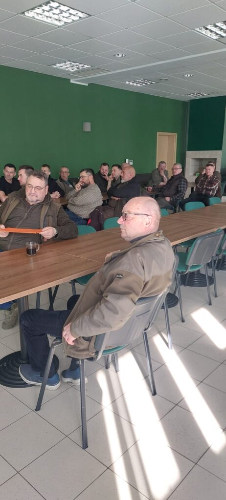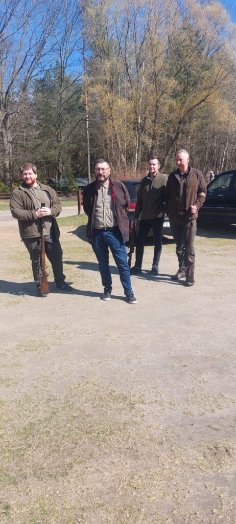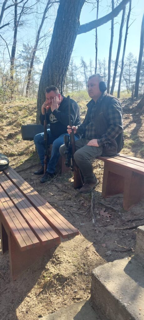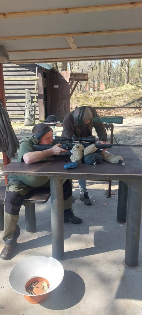 Po zakończeniu części teoretycznej przenieśliśmy się na strzelnicę, gdzie odbyło się obowiązkowe, coroczne przystrzeliwanie broni. Nad sprawnym i bezpiecznym przebiegiem tej części czuwali koledzy W. Klotz oraz A. Pluciński. Dużym wsparciem dla uczestników okazała się obecność kolegi Wojtka Pałki, który służył swoją wiedzą i doświadczeniem w zakresie precyzyjnego ustawiania urządzeń optycznych. Dzięki jego fachowej pomocy każdy myśliwy mógł mieć pewność, że jego sztucer jest idealnie przygotowany do nadchodzących wyzwań w łowisku.